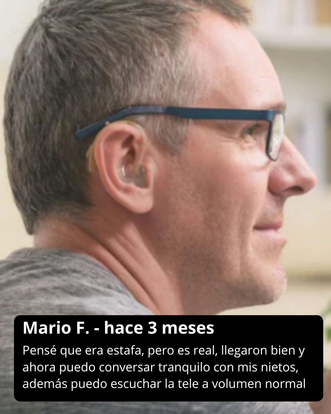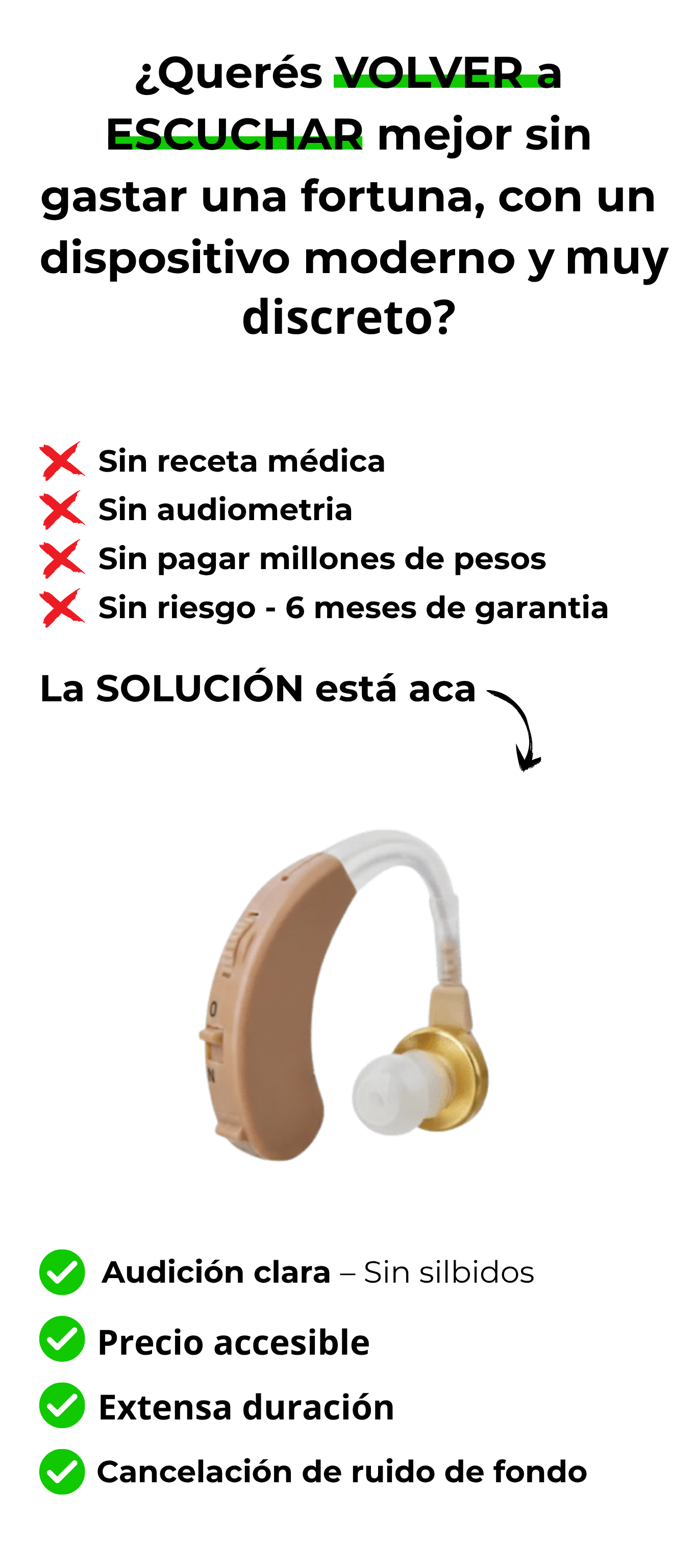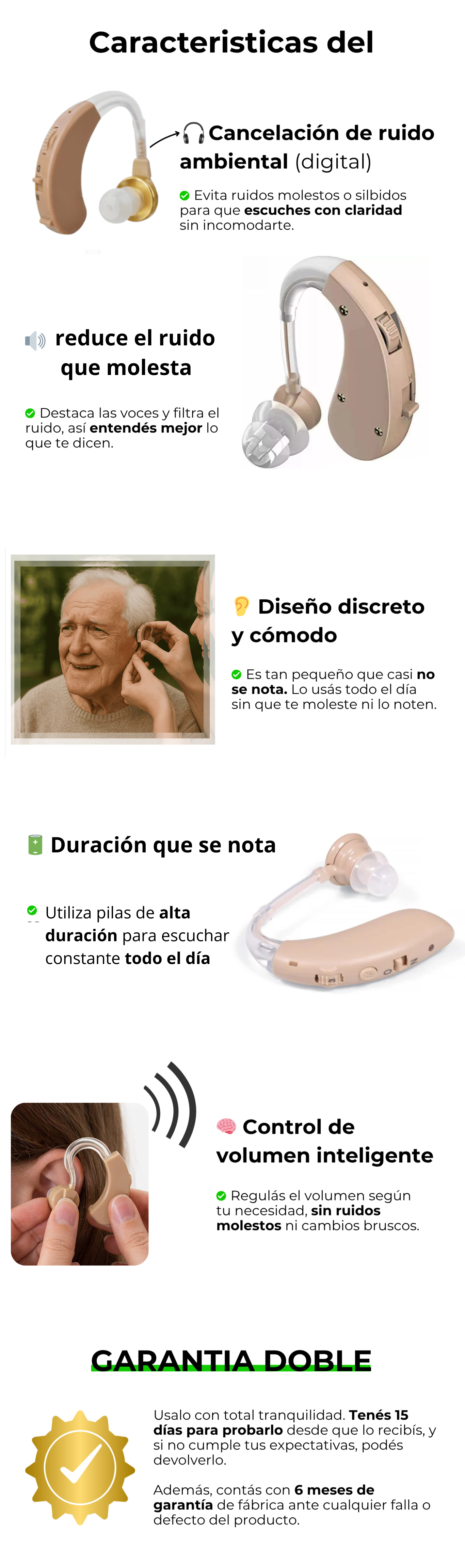 Correcto, hay un ligero ruido de fondo, pero el sonido está bien amplificado. Se escucha un chirrido al colocarlo, pero desaparece en cuanto los dedos se alejan del oído.